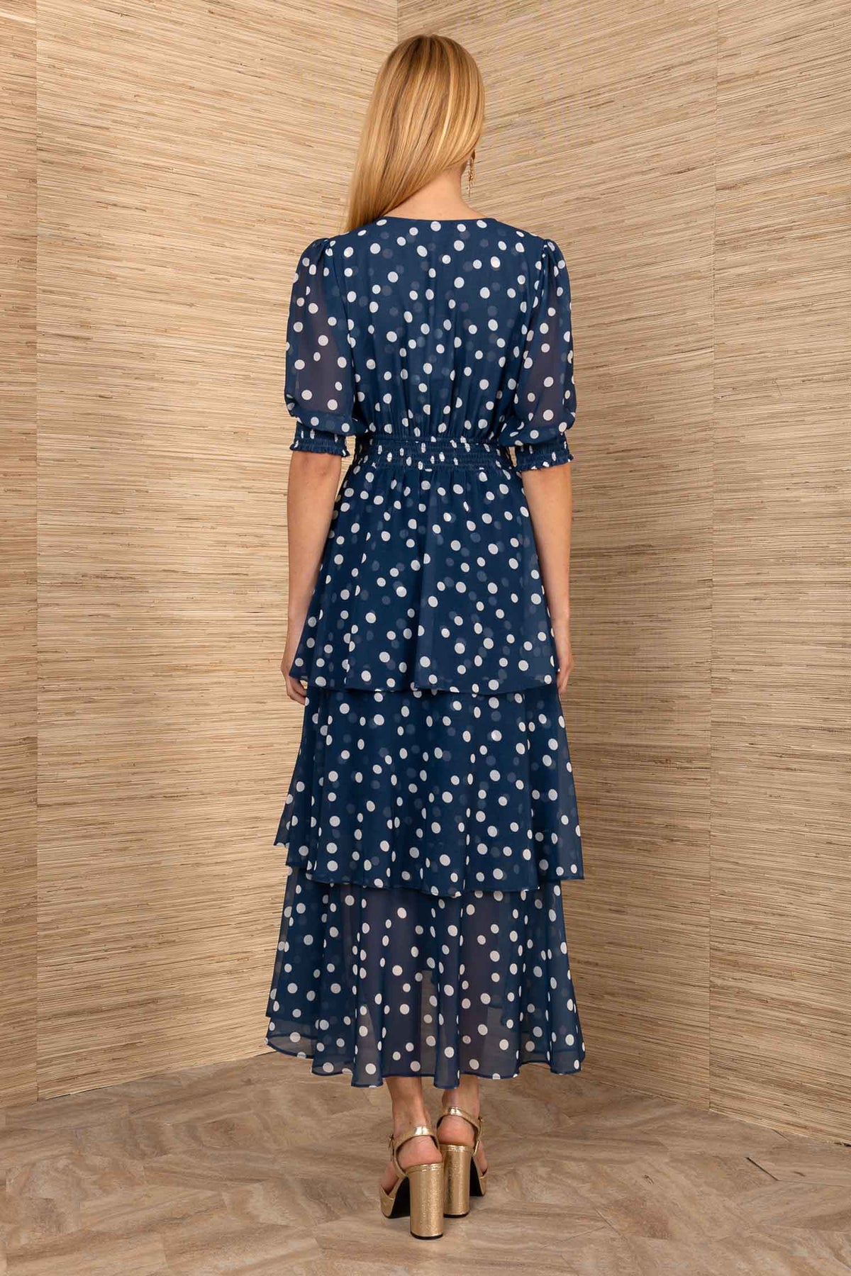 The Kiera SS Tiered Dress from Hale Bob is a dreamy design. It is a floaty design with many feminine touches such as; a lovely v-neckline and short puffed sleeves. It falls to an ankle-length with a stunning polka dot print on a floaty chiffon. With a beautiful hi-low ruffled skirt and a flattering shirred waistband to accentuate the shape, you will love wearing the Kiera again and again.