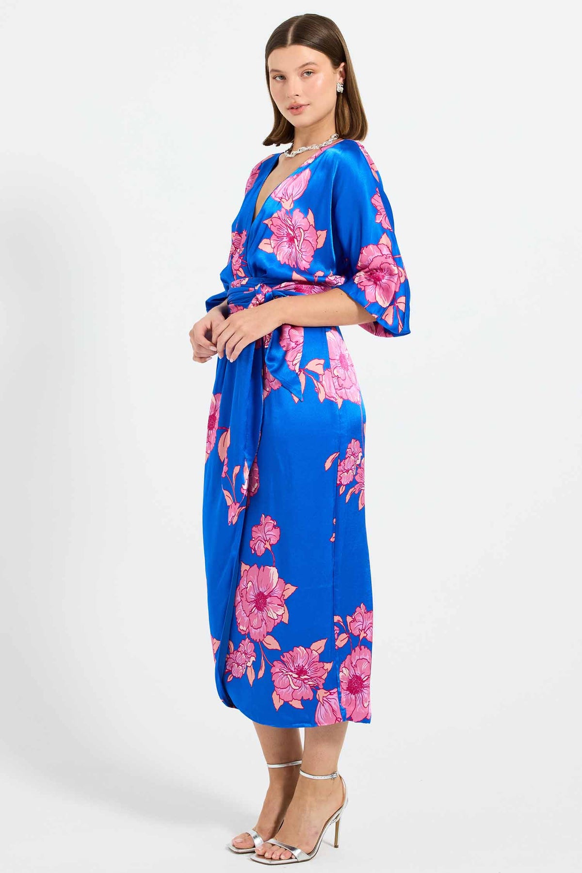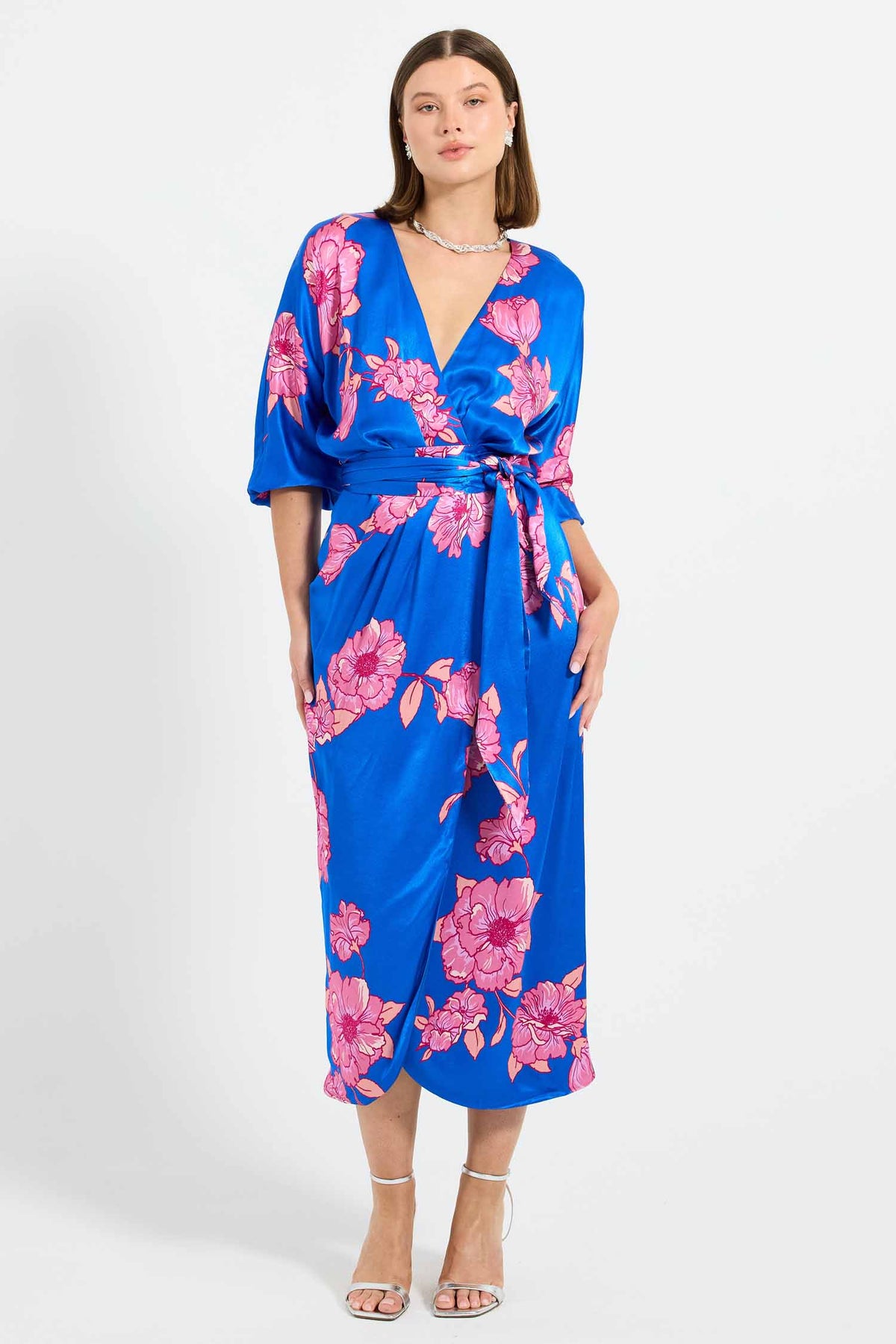 The Margot Wrap Midi Dress from Pasduchas is crafted from lustrous satin fabric featuring an exclusive floral print. It features a tulip-style mock wrap, secured at the waist with a self-tie to flatter the figure. Batwing sleeves, secured with elastic, balance the blouson bodice. The skirt falls to a traditional midi-length hem, creating a modest yet elegant silhouette. Lined from the waist down for added comfort, this piece is a refined option for special occasions or elevated day-to-night dressing.