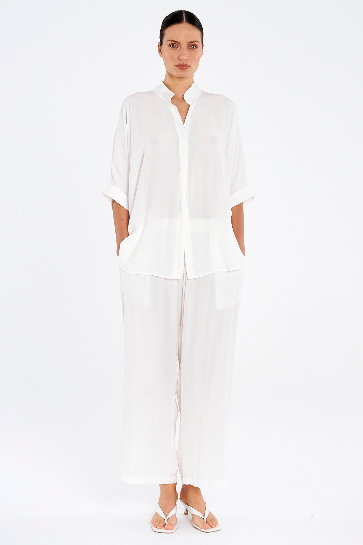 Crafted from Mela Purdie's smooth, airflow finish Mache, the Pace Pant highlights a wide-leg silhouette in a slightly cropped length, perfect for showing off a statement shoe. The pull-on, elasticized waist and hip pockets allow comfort and fluidity during wear.