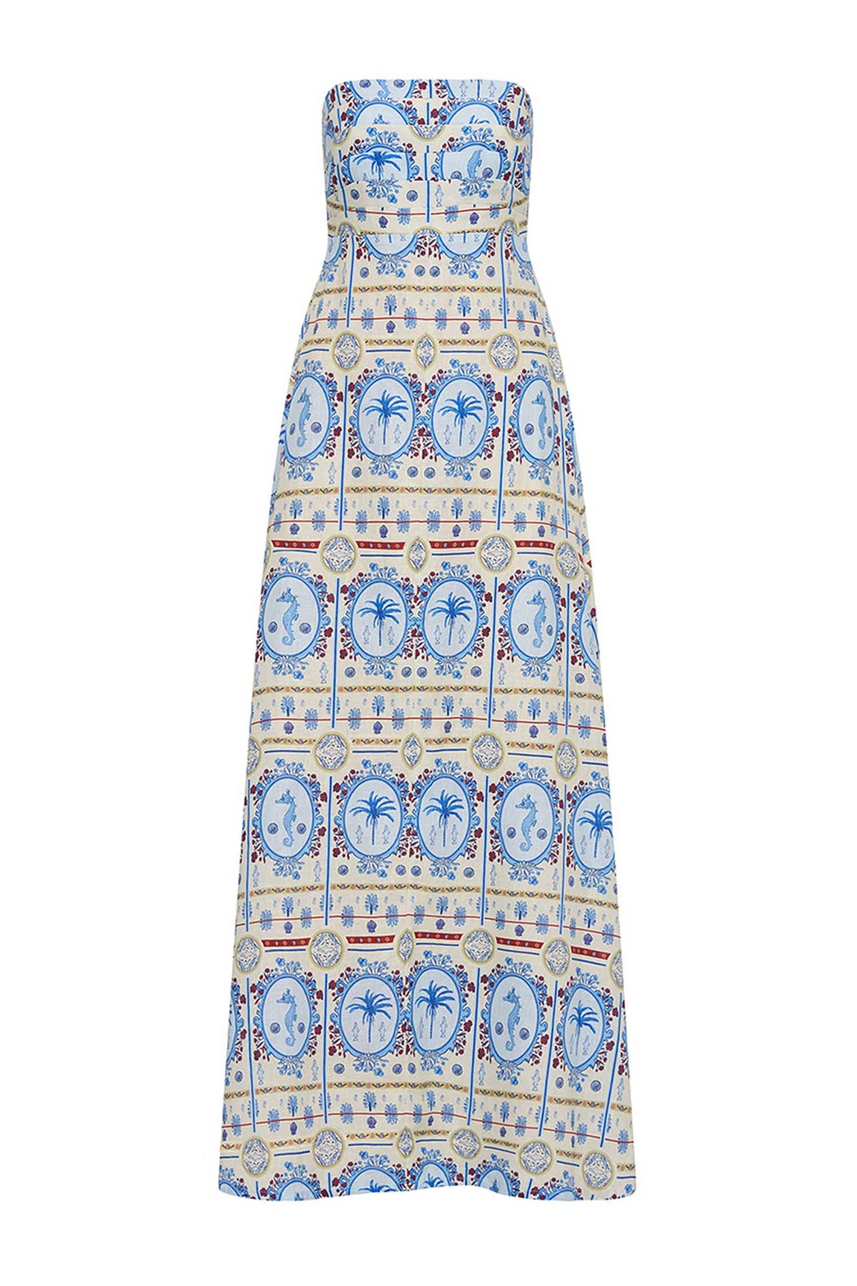 The Primrose Dress in Palm Noosa's exclusive Lagoona Tile is crafted in a premium 100% linen. Designed as a strapless maxi silhouette, the Primrose Dress features a fitted bodice with a shirred elasticated back panel, an A-line skirt, and comes with detachable adjustable straps for versatile styling. Pair with slides or wedge heels to your next beach event.