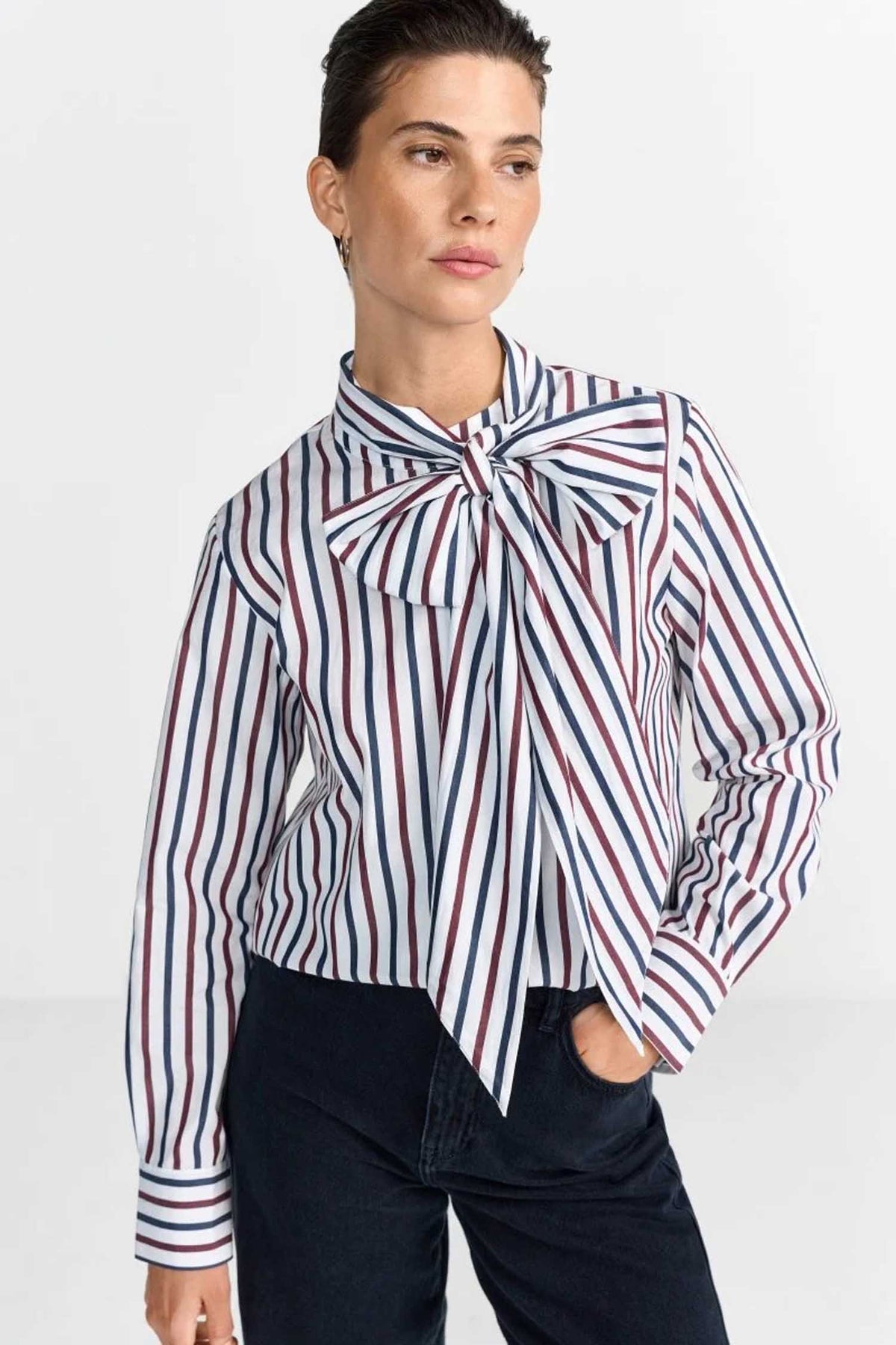 The Striped Blouse with Bow in Midnight Blue from Rich & Royal brings feminine sophistication to your looks. The relaxed fit, the modern striped pattern in navy, off-white and burgundy, as well as classic details, make it a stylish all-rounder for the office and your everyday outfits. Pair with navy pants or denim and dress it up or down to suit the occasion.Ā