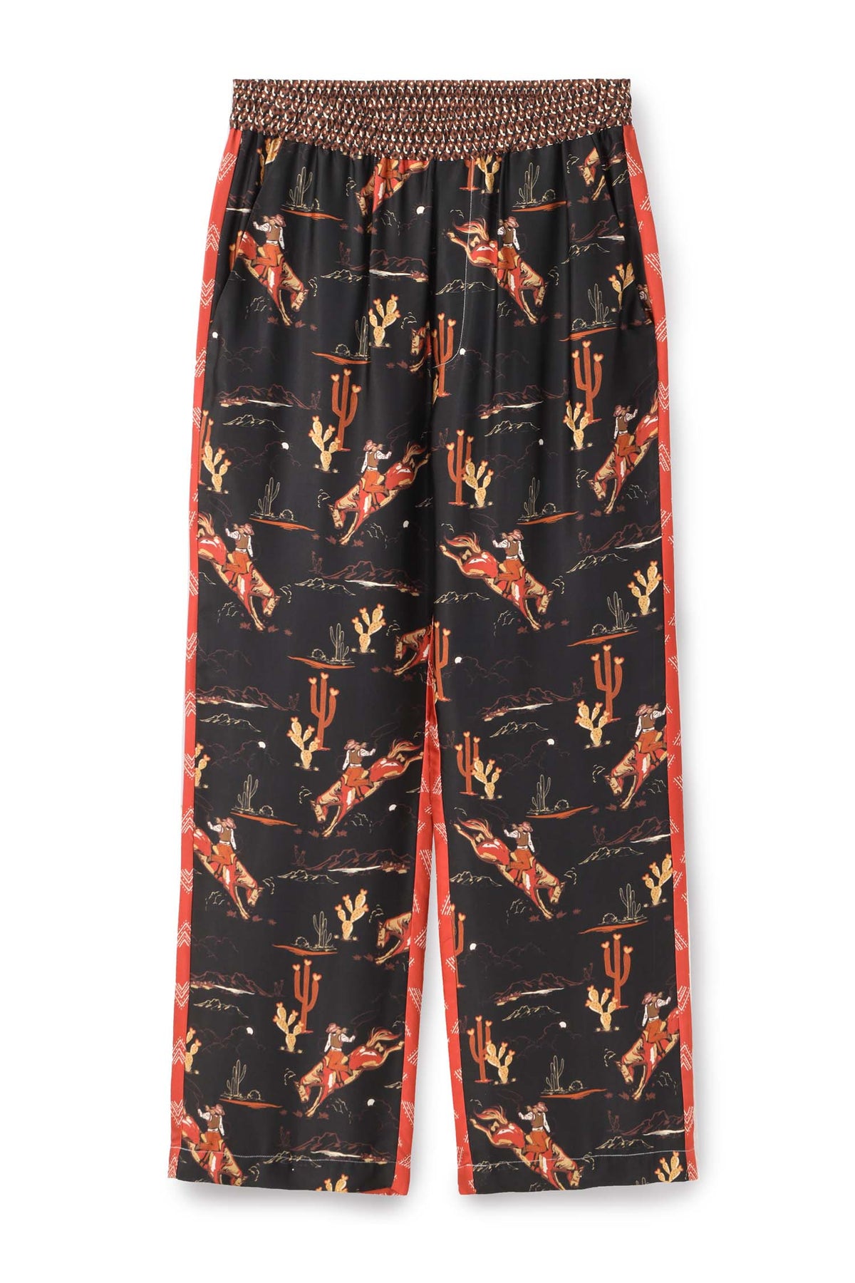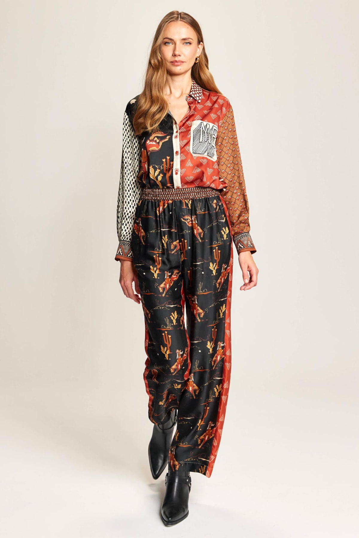 The Bailey Straight Leg Track Pant in Rodeo from Me369 combines comfort and bold style with an elastic waistband and practical pockets at the sides and back. Featuring bucking broncos on the front and an orange geometric print on the back, these pants make a striking statement. Pair with the matching Isabel shirt for a cohesive, artistic outfit. True to size, choose your usual fit.