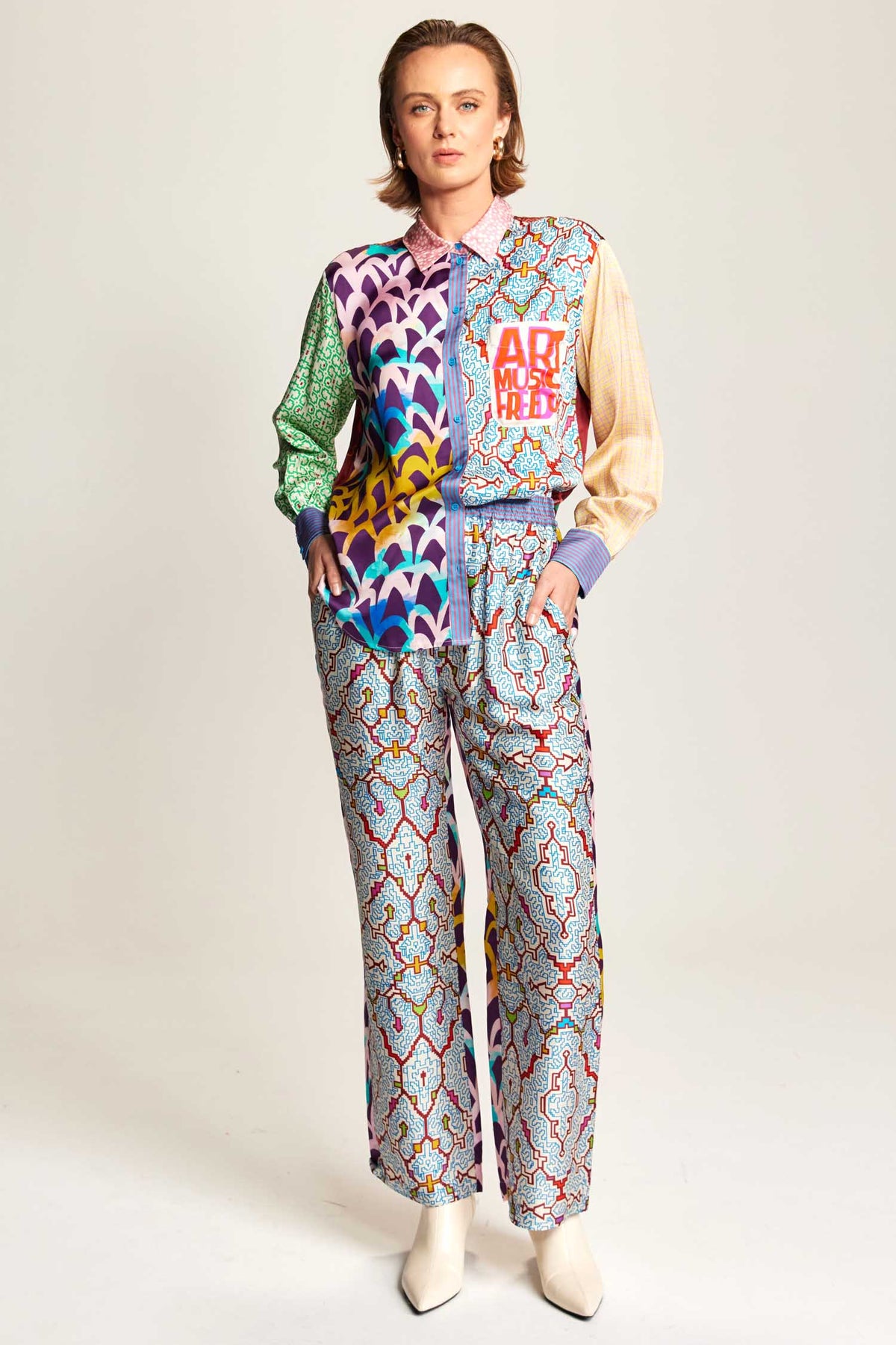 The Bailey Straight Leg Track Pant in Shipibo from Me369 combines comfort and bold style with an elastic waistband and practical pockets at the sides and back. It features an Asian feel to the front and a rounded geometric print in the back. Pair with the matching Isabel shirt for a cohesive, artistic outfit. True to size, choose your usual fit.