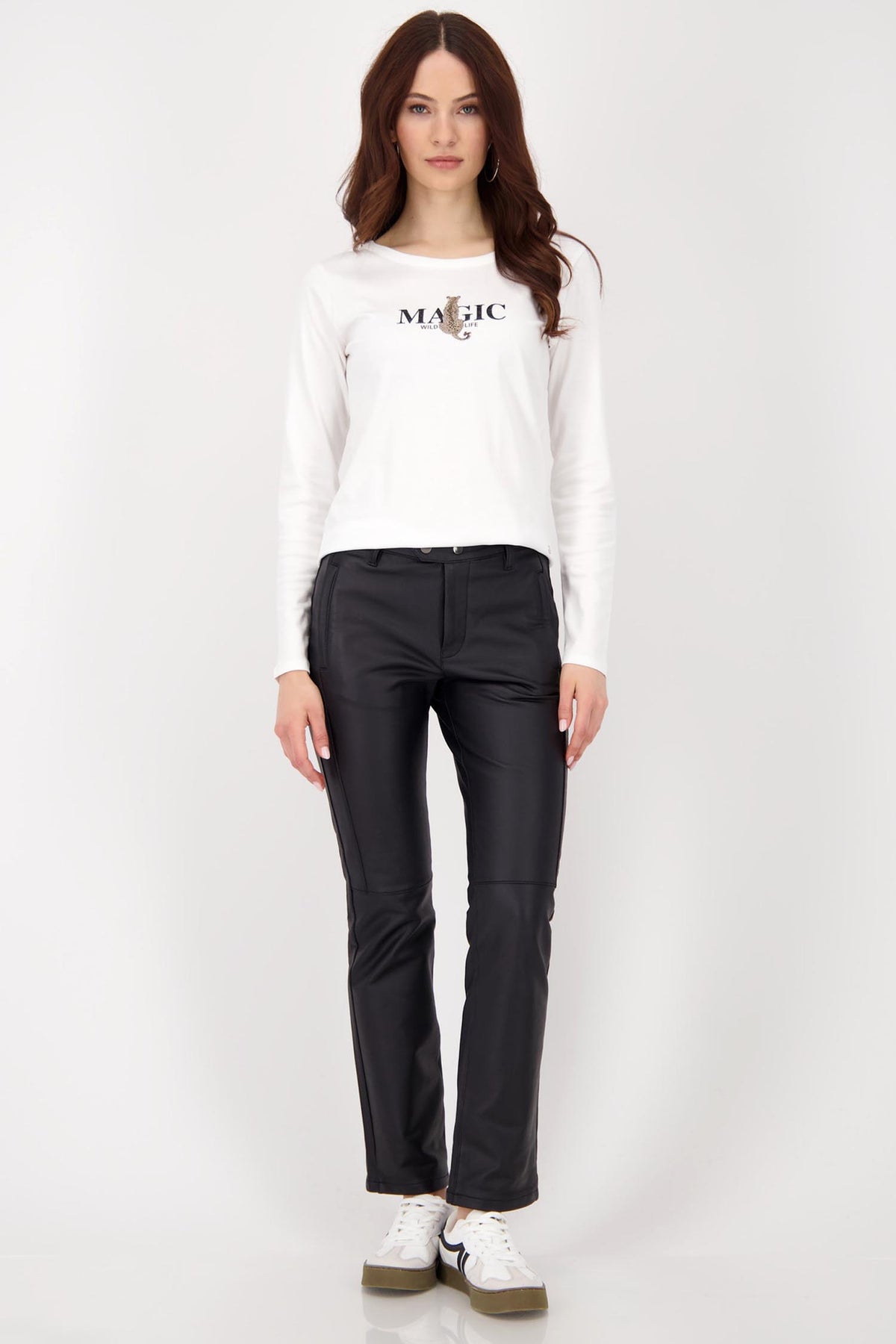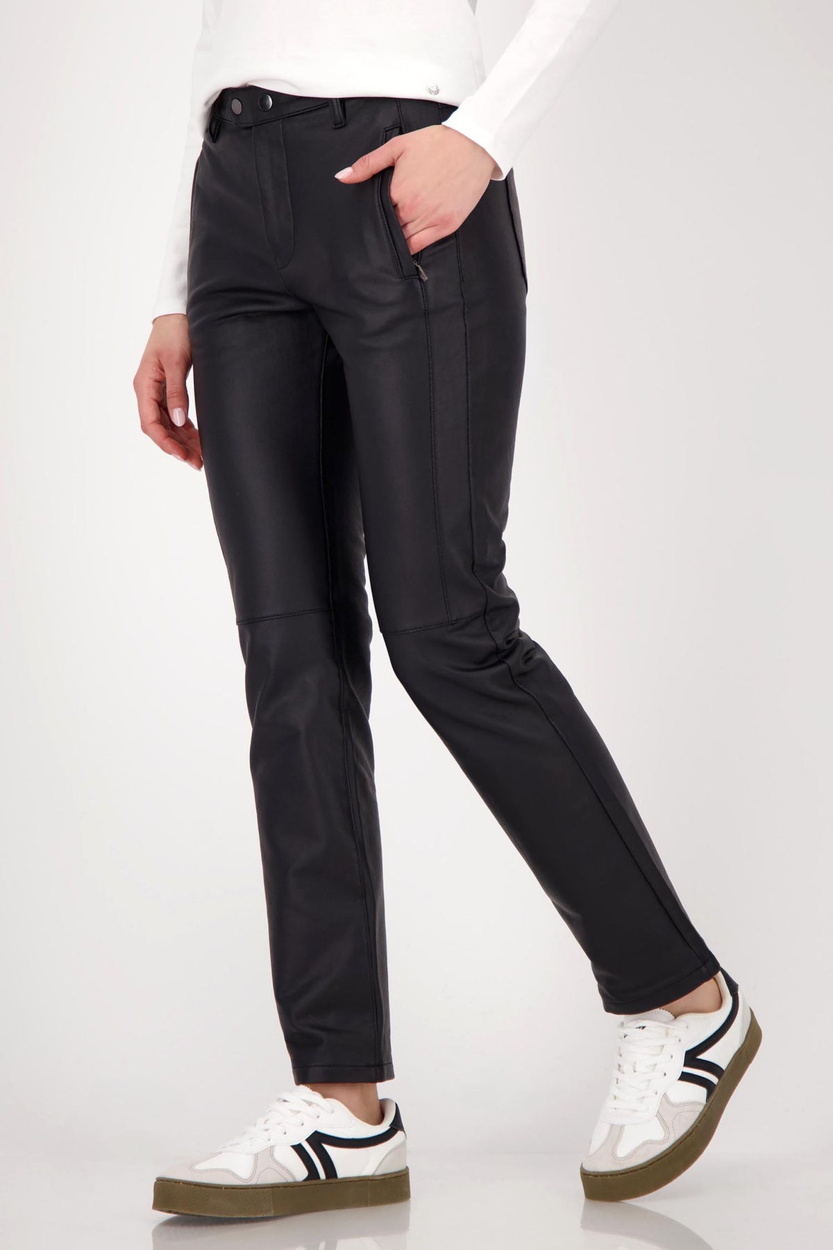 Upgrade your wardrobe with these Straight Leather Pant from Monari, designed in modern faux leather for a sleek, on-trend finish. Made from a high-quality cotton blend with added stretch, they offer a soft feel and comfortable flexibility, while the flattering straight cut creates a streamlined silhouette. Functional side pockets with zip and snap closures add a practical yet fashionable touch, making these versatile trousers perfect for both casual and dressed-up looks.