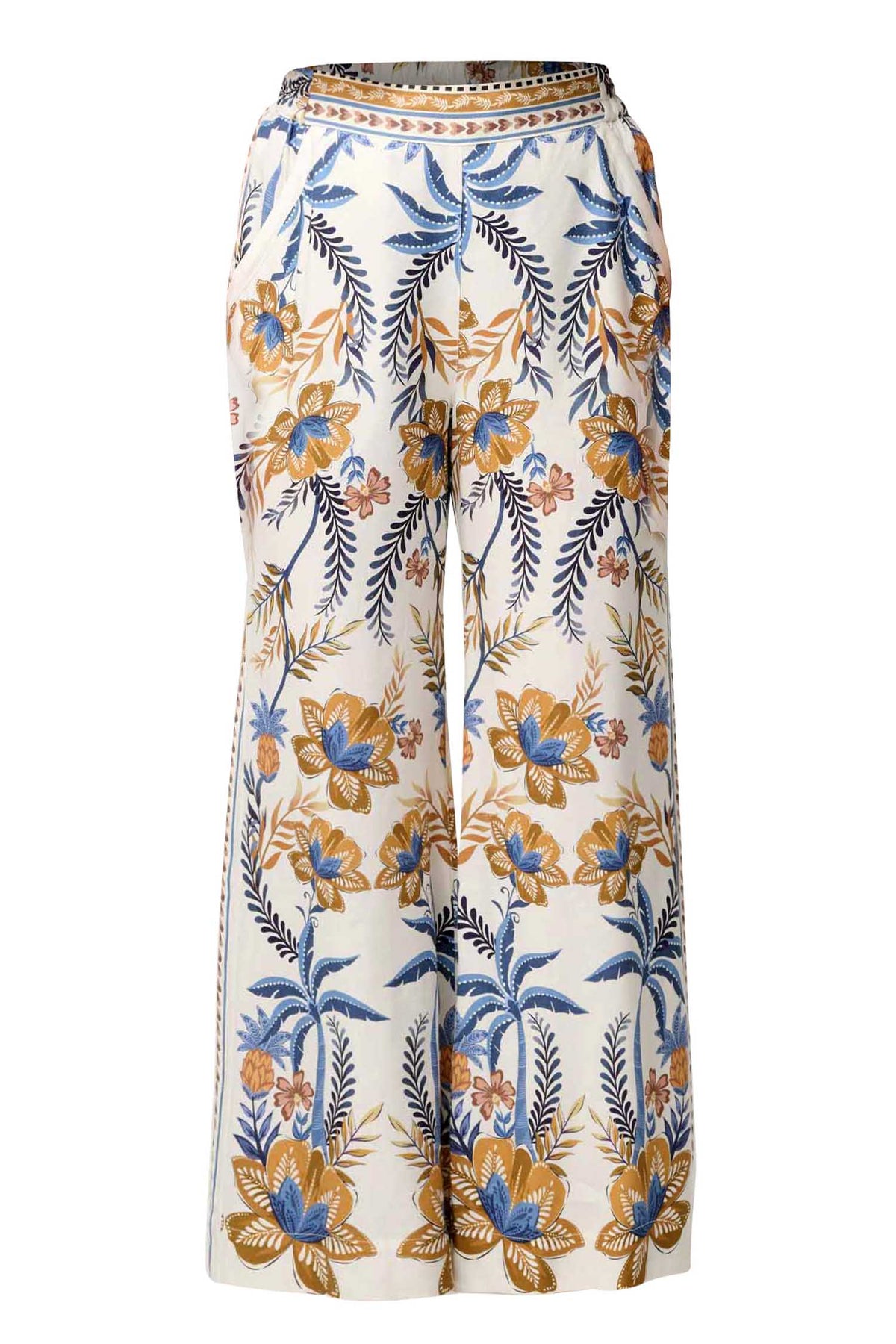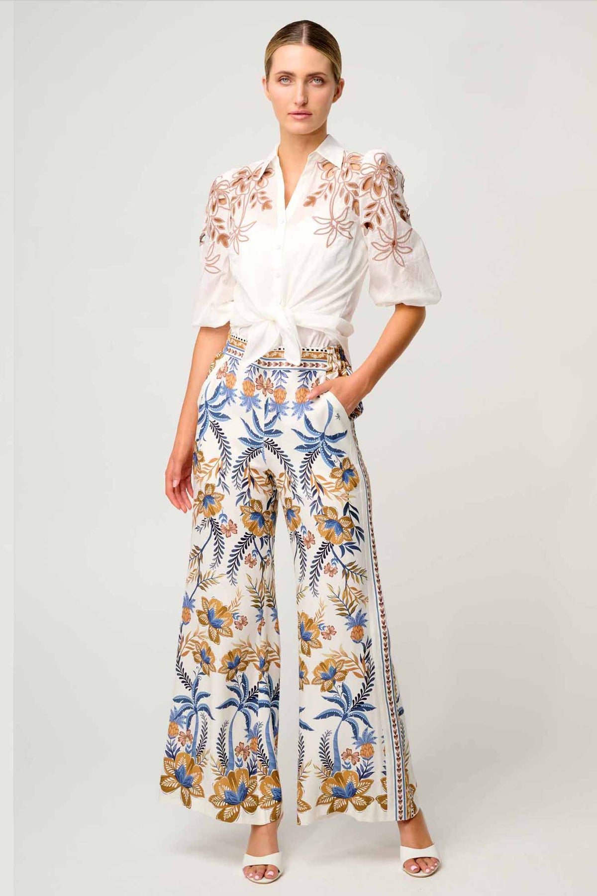 The Golden Medina print showcases rich blue and golden floral motifs inspired by exotic landscapes, making these pants perfect for both resort escapes and city styling. Designed with a high-rise waist, side pockets, and a fluid wide-leg silhouette, they strike the perfect balance between relaxed and refined. Subtle border print detailing at the hem adds a designer touch, ensuring these pants stand out in any wardrobe.