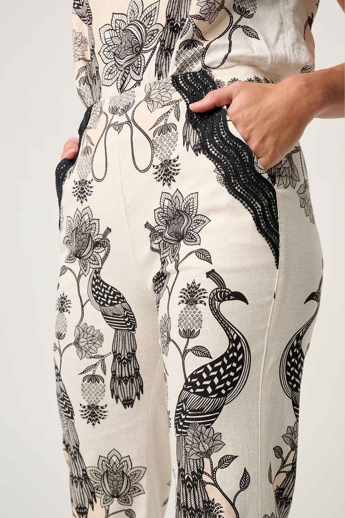 The tailored silhouette is enhanced with exclusive black placement prints, featuring elegant peacocks, lotus florals, and botanical motifs, artistically arranged to elongate the legs and draw the eye. Intricate contrast lace trim panels run vertically along the outer seams, adding a touch of romantic detail while accentuating the pants’ clean, elongated lines.