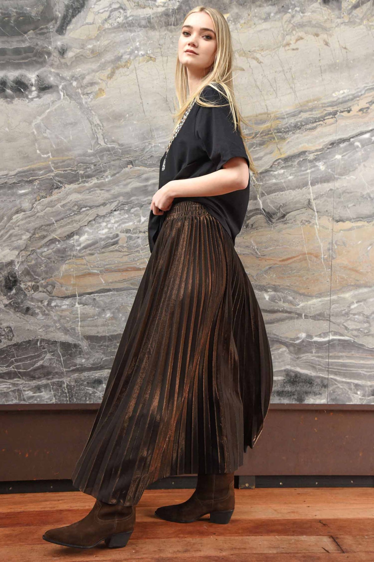 Step into shimmering elegance with the Forever Long Skirt in Brown from Curate, crafted in the iridescent ‘Pleat-ing to the Eye’ fabric. Sunray pleats catch the light with every movement, while an elasticated waistband ensures effortless comfort and a flattering fit. Flowing and luminous, this skirt brings a touch of magic to both day and evening looks.