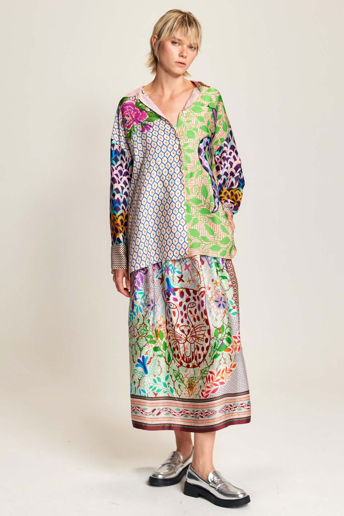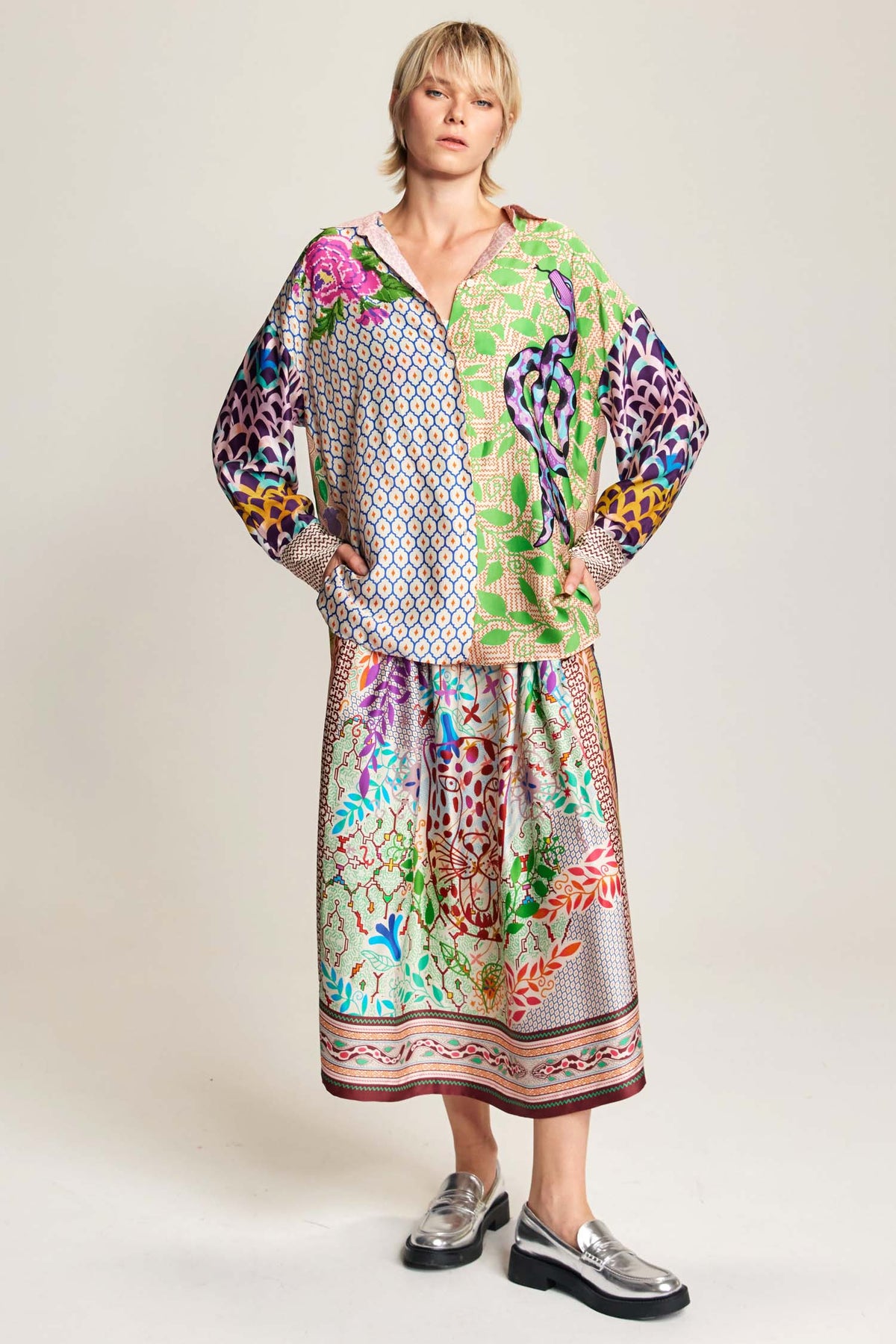 The bold, multicolour tiger-inspired motif adds dynamic energy and a fierce, fashion-forward edge to everyday styling. Pair it with a simple knit or tailored blouse to let the print take center stage, or embrace maximalism with equally vibrant layers for a confident, standout look.