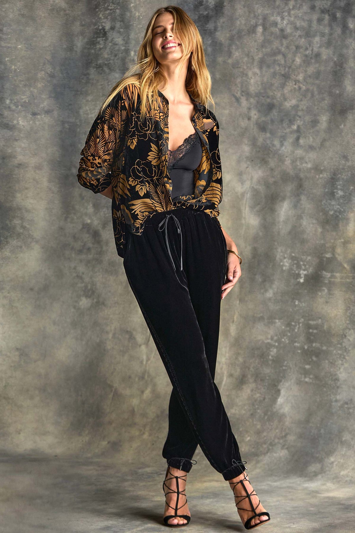 Beautifully crafted with an intricate floral motif in burnout velvet, the Audrey Shirt with Shirt Tail Hem from Johnny Was offers a fresh take on classic shirting. Featuring a collared button-front and drop shoulders, this cami-lined shirt is finished with a gently curved hemline. Pair with coordinating leggings and trendy ankle boots for a polished weekend ensemble.