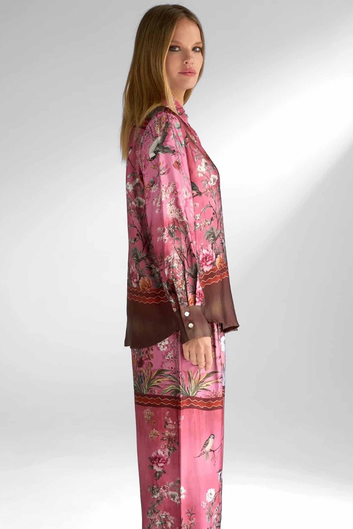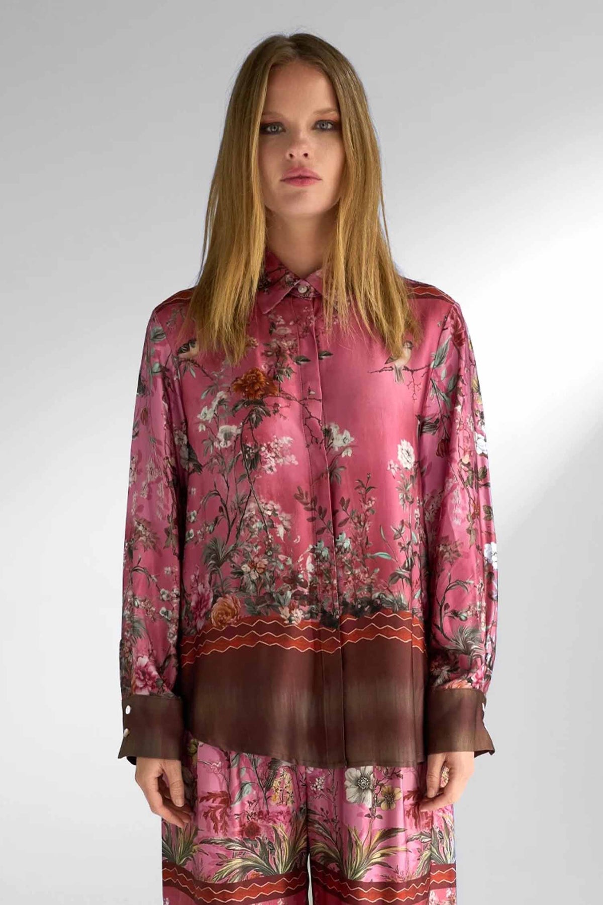 The Cherry Blossom Blouse in Rose Chocolate from Miss Goodlife explores fresh hues and gradients with a romantic touch. A dreamy, soft viscose blouse with a beautiful print featuring striking contrasting shades of pink, red, and brown. It features a classic Kent collar with a concealed button placket. A casual cut for stylish everyday looks or special occasions.