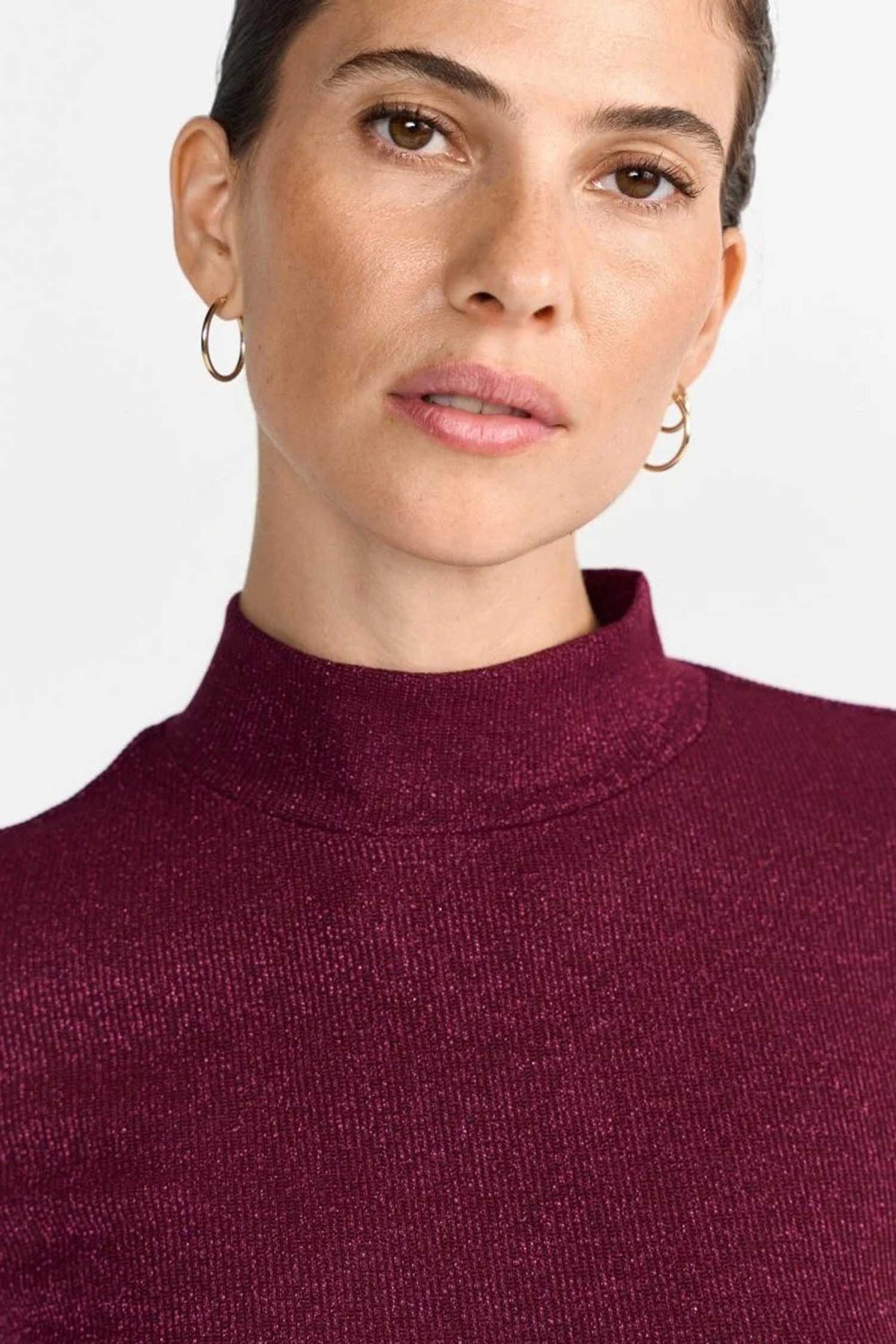The Ev Glam Rib Turtle LS in Ruby Glow from Rich & Royal is a burgundy knit sweater, with delicate shimmering threads that add a touch of glamour to your wardrobe. The short stand-up collar and figure-hugging cut lend your look an elegant touch. Pair with jeans as is or wear under suiting for a chic desk to dinner look.