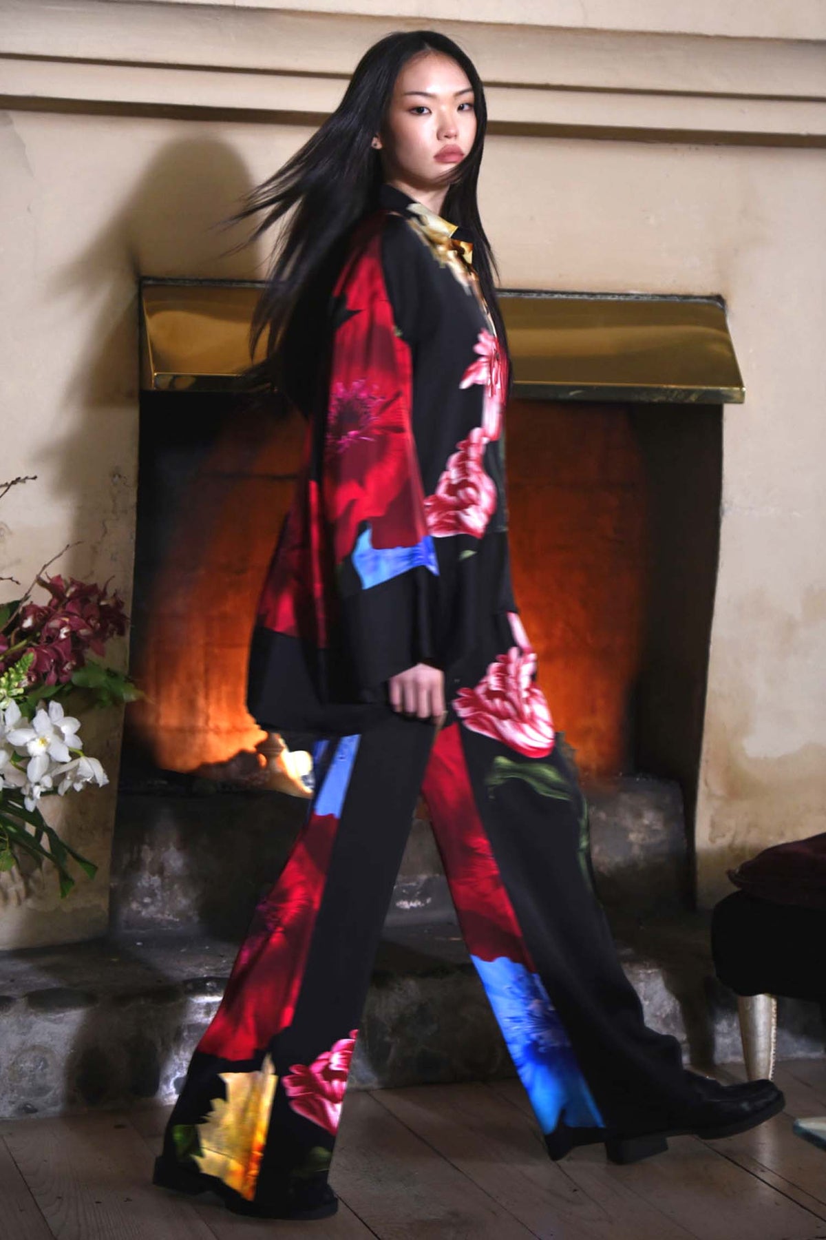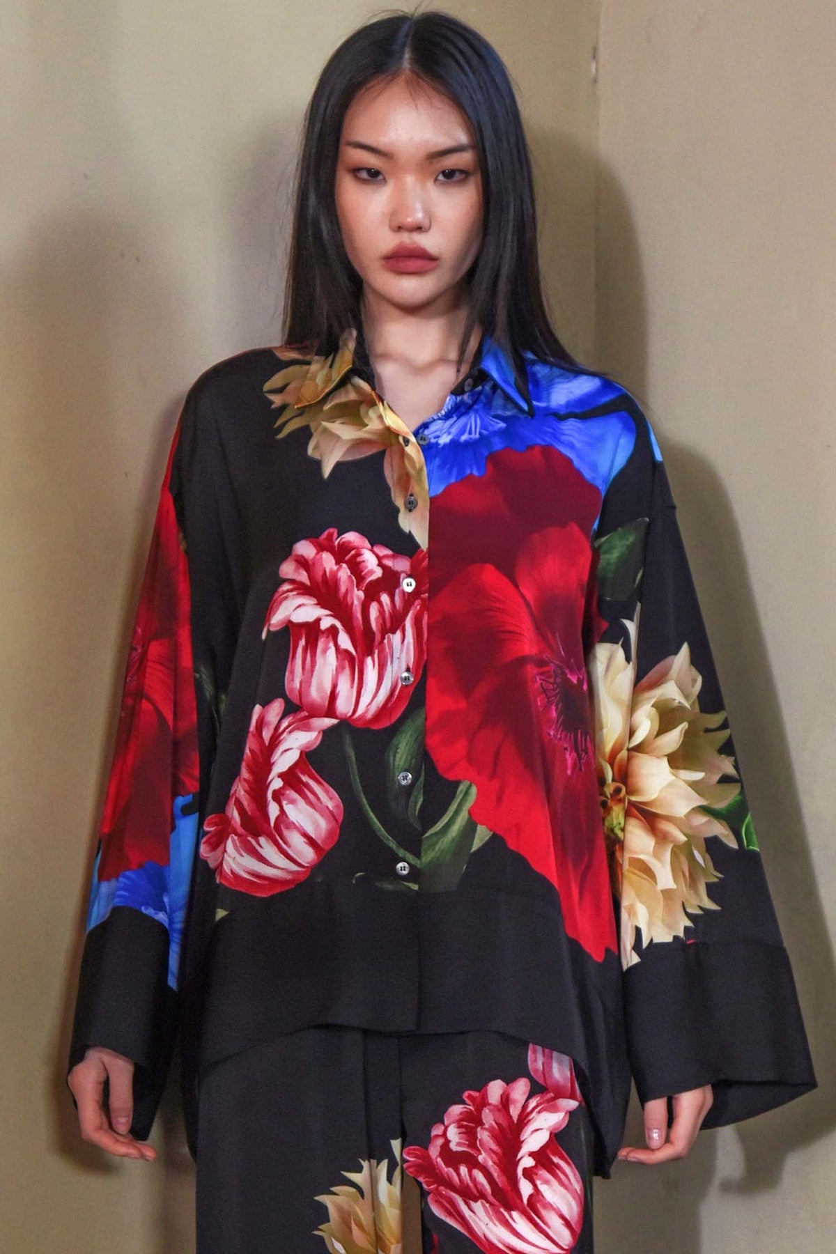 Bold florals take centre stage on the slinky 'Heavy Petals' viscose satin, making the Glossy Goddess Blouse from Trelise Cooper is a statement piece for effortless elegance. Designed with a button-through front and a timeless collar, its wide cut sleeves flow gracefully into deep cuffs, while the tailored hem adds structure to this fluid silhouette. Perfect for both day and night, it blends classic tailoring with a modern, floral flourish.