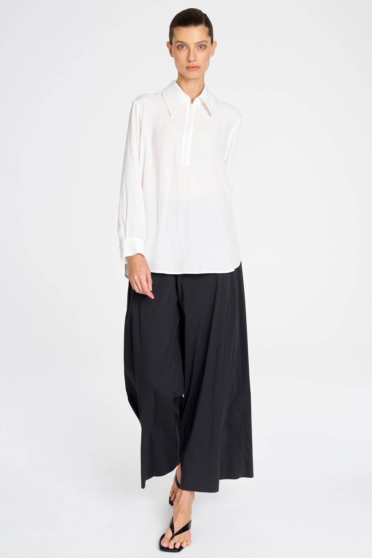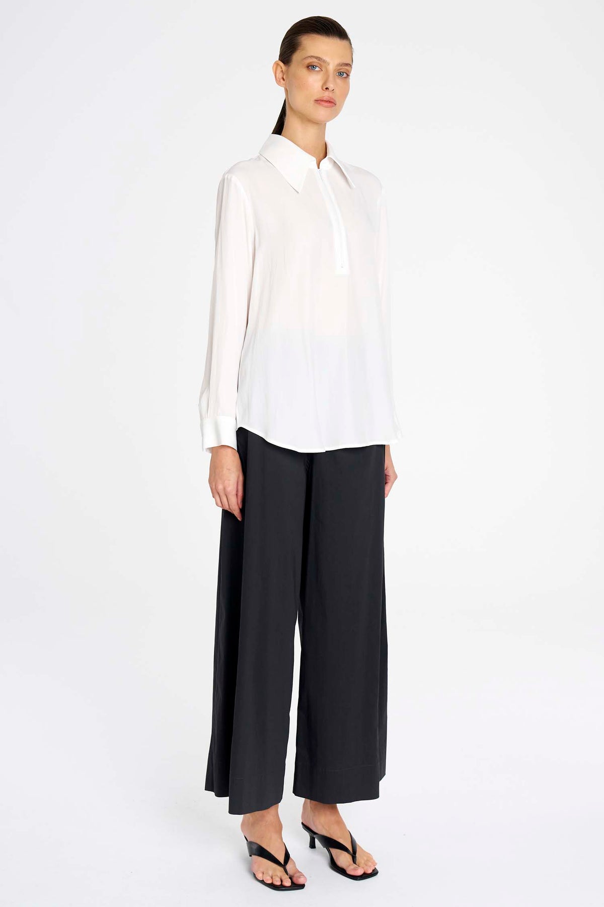 A crisp peak collar frames the neckline, complemented by a sleek zip closure for a contemporary edge. Classic shirt sleeves with tailored cuffs balance the design, while a centre back pleat enhances movement and comfort. The curved hemline allows for versatile styling - worn tucked for a refined look or left loose for relaxed sophistication.
