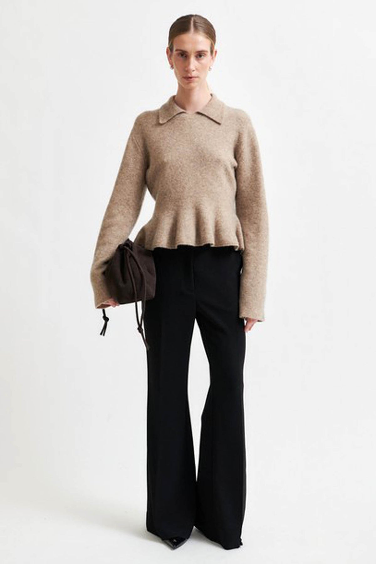 Cozy meets chic in the Selena Knit Collar in Camel Melange from Second Female. A soft, long-sleeved pullover designed for effortless layering and year round wear. Made in a soft and stretchy wool blend with fluffy texture it features a ribbed collar and a peplum flounce at the bottom that creates a feminine silhouette. The perfect sweater to wear with both pants and skirts for a dressed-up everyday look or a stylish evening style.